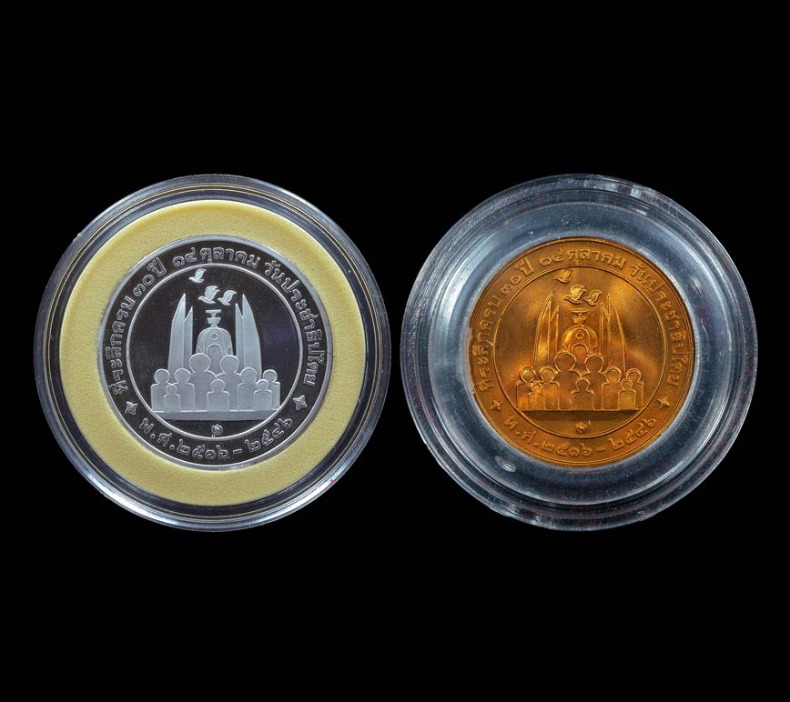 เหรียญ ที่ระลึกครบ 30 ปี 14 ตุลาคม ( 2516 - 2546 ) วันประชาธิปไตย พ.ศ.2546 ( เนื้อเงิน - ทองแดง , กล่องชุดทองคำ 4.5 X 6.5 นิ้ว ) |