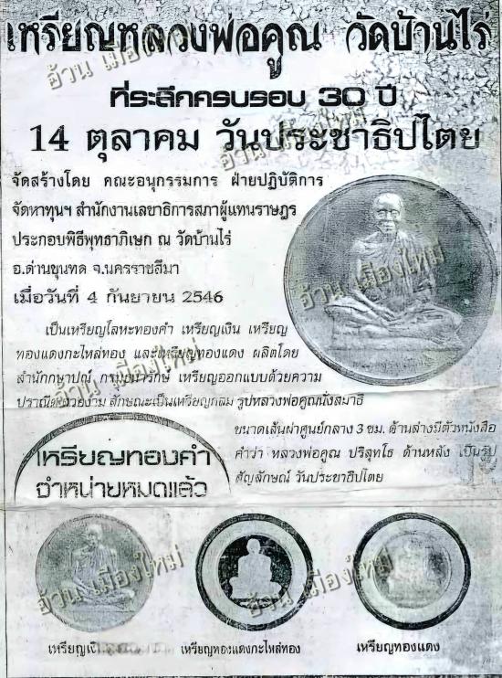 ++วัตถุประสงค์ : ที่รัฐสภาวันที่ 12 ตุลาคม พ.ศ.2546 เวลา 10:30 น. นายวิชิต ปลั่งศรีสกุล ประธานอนุกรรมการ จัดจำหน่ายเหรียญที่ระลึกครบรอบ 30 ปี 14 ตุลาคม วันประชาธิปไตย 2546 มีมติให้จัดสร้างเหรียญที่ระลึก หลวงพ่อคูณนั่งสมาธิ ขนาดเส้นผ่าศูนย์กลาง 3 เซนติเมตร