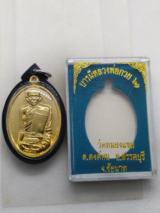 เหรียญอุ้มบาตร หลังยันต์ครู หลวงพ่อกวย ชุตินธโร กะไหล่ทอง รุ่นบารมีหลวงพ่อกวย61 พร้อมเลี่ยม สภาพสวย กล่องเดิม