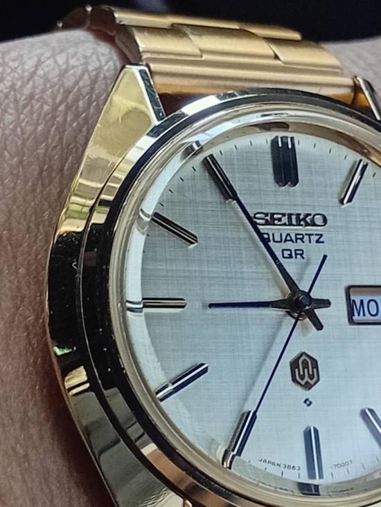 นาฬิกา Seiko QR ระบบ Quartz Japan Movement ตัวนี้ผลิตช่วงประมาณปี 1973 เครื่อง 38XX Series เป็นเครื่องที่เริ่มใช้ในช่วงยุค 70s และถูกแบ่งเป็นโมเดลอย่าง SQ, QT, QR และ QZ Quartz ตัวเรือนวัสดุเป็น All Stainless Steel ฝาหลังนูน หน้าปัดลายผ้า เล่นแสงสวย หลักขีดนูนเซาะร่องกลาง ชุดเข็มทรงก้านไม้ขีด 3เข็มแท้ พร้อมระบบ Date สับเปลี่ยนตามรอบ24ชั่วโมง ขนาด 38mm (รวมเม็ดมะยม)