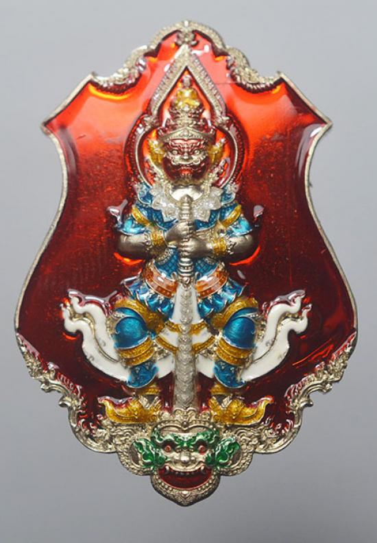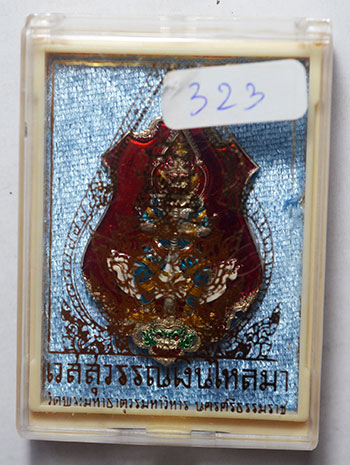 เหรียญท้าวเวสสุวรรณ รุ่น เงินไหลมา วัดพระมหาธาตุ นครศรีธรรมราช เนื้อกะหลั่ยเงิน ลงยาราชวดี พื้นแดง เลข 323