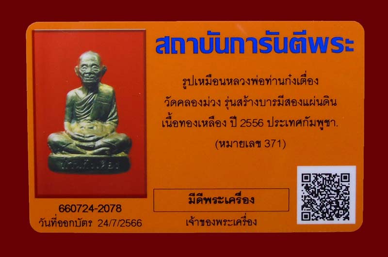 รูปเหมือน เนื้อทองเหลือง ก๋งเตื่อง วัดคลองม่วง จ.ตราด (หมายเลข 371) ปี2556 + บัตรพระแท้ |