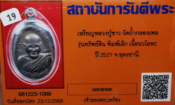 เหรียญหลวงปู่ขาว วัดถ้ำกลองเพล รุ่นทรัพย์สิน พิมพ์เล็ก เนื้อนวโลหะ ปี2521 จ.อุดรธานี + บัตรG-pra สภาพสวยเดิมค่ะ |
