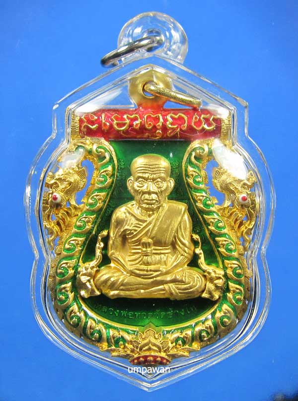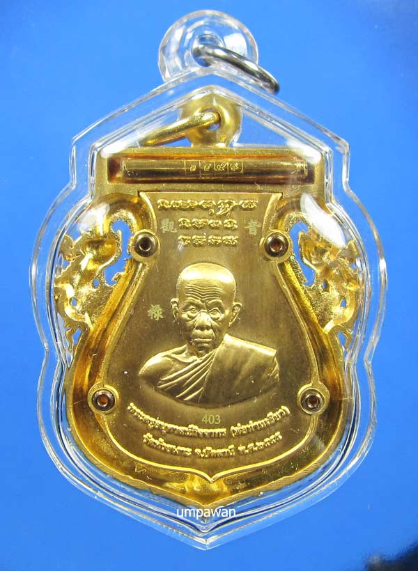 "วัดใจ" เหรียญเสมาฉลุยกองค์หลวงพ่อทวด(พิมพ์หน้าเลื่อน)หลังพ่อท่านเขียว ฝังตะกรุดทองคำยันต์รับทรัพย์ "รุ่น กิตติคุโณมหามงคล" เนื้อบรอนซ์ชุบทอง ลงยาซุ้มพญานาคฉากสีเขียว สภาพสวยพร้อมกล่องเดิม หมายเลข 403