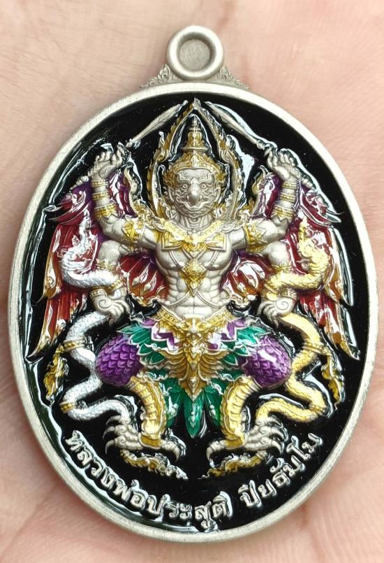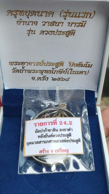 เหรียญครุฑหยุดนาครุ่นแรก"ดวงประสูติ"หลวงพ่อประสูติ ปิยธัมโม วัดถ้ำพระพุทธโกษีย์(ในเตา)จ.ตรัง เนื้ออัลปาก้าซาติน ลงยาดำ หลังยันต์ดวง อุดมวลสารเกษาลพ.ประสูติ เลข ๒ พร้อมกล่อง เลขรองแม่ทัพ เลขตัวเดียว..