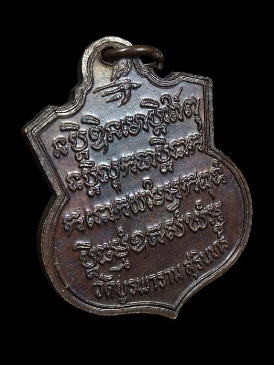 ด้านหลังเป็นตัวอักษรขอม ซึ่งเป็นคาถาเเบบเดียวกับที่หลวงปู่จารในแผ่นตะกรุด