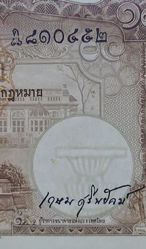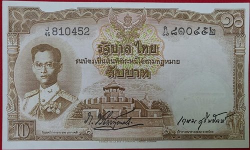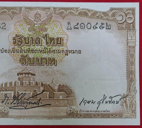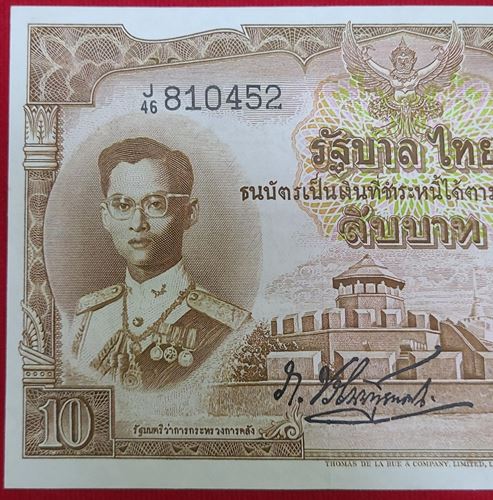 รายละเอียด ธนบัตร 10 บาท โทมัส ในหลวงรัชกาลที่ 9 สภาพใหม่ ไม่ผ่านการใช้งาน ลายน้ำพานฯ หายาก หมายเลข 46J 810452-๔๖ด ๘๑๐๔๕๙ ลายเซ็น ภ.บริภัณฑ์ยุทธกิจ-เกษม ศรีพยัคฆ์ ขนาด 8.7 X 14.7 ซ.ม.ประกาศใช้เมื่อ วันที่ 25 พ.ย.2498
