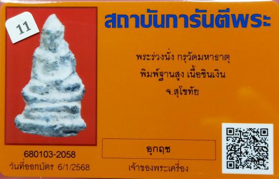 เคาะเดียว พระร่วงนั่ง กรุวัดมหาธาตุ พิมพ์ฐานสูง เนื้อชินเงิน จ.สุโขทัย พร้อมบัตรรับรองจากจีพระ |