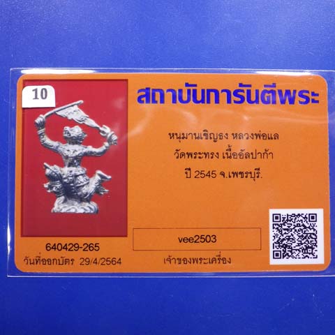 ชื่อพระเครื่อง หนุมานเชิญธง หล่อโบราณ เนื้ออัลปาก้า หลวงพ่อแล วัดพระทรง จ.เพชรบุรี ปี 2545...10... (65.10.2