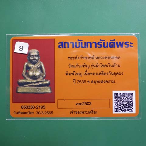 พระสังกัจจายน์หลวงพ่อหยอด รุ่นนำโชคเงินล้าน พิมพ์ใหญ่ เนื้อทองเหลืองก้นอุดผง วัดแก้วเจริญ ปี 2536.....9 ...(65.9.20 |