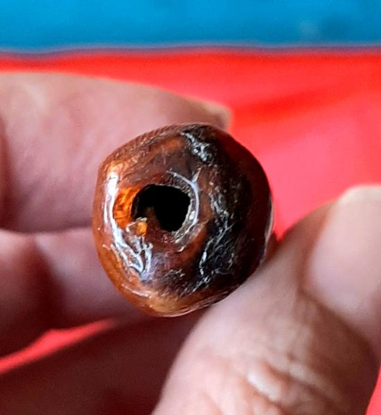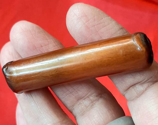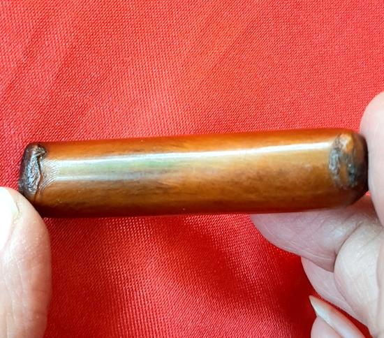ตะกรุดหนังเสือ หุ้มด้วยพลาสติก เก่า ลนไฟ ปิดหัวปิดท้าย มีรู ไว้ร้อยเชือกแขวน