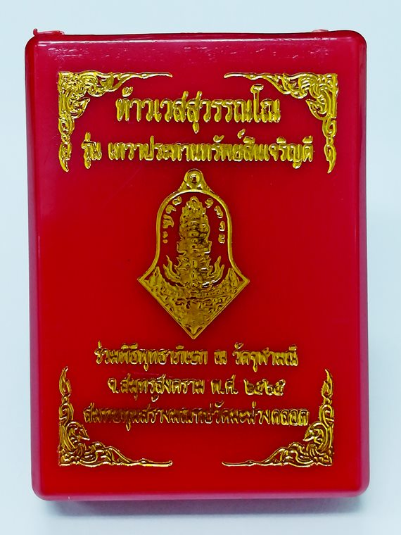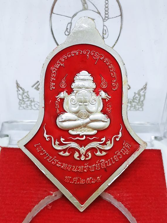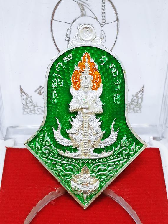 เหรียญท้าวเวสสุวรรณ พิมพ์ทรงจำปี รุ่น เทวาประทานทรัพย์สินเจริญดี หลวงพ่ออิฏฐ์ วัดจุฬามณี อุปถัมถ์ (ขนาดเหรียญสูง 4 ซม.) เนื้อเงินลงยาเขียว หลังลงยาแดง |