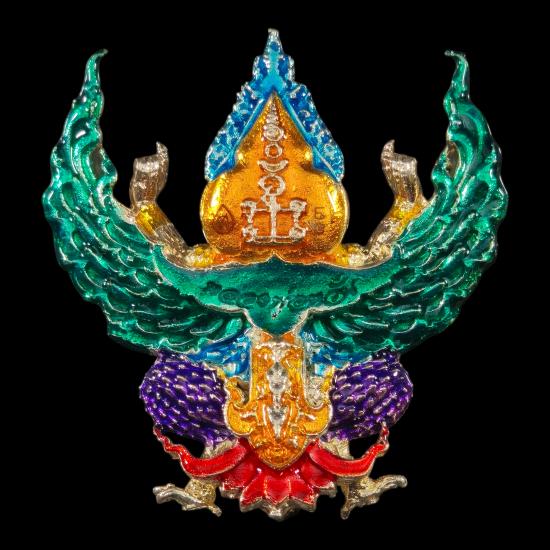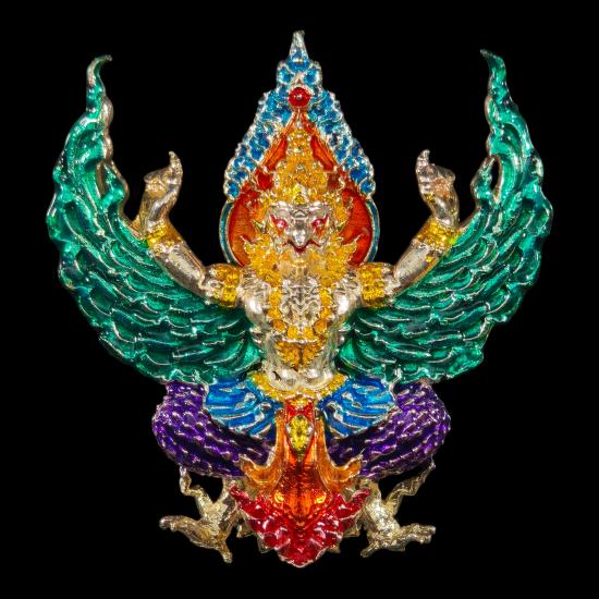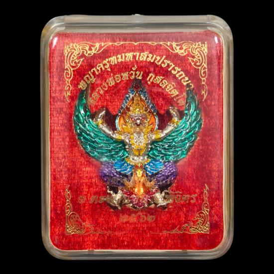 พญาครุฑมหาสมปรารถนา หลวงพ่อหวั่น กุสลจิตฺโต วัดคลองคูณ จ.พิจิตร ๒๕๖๒ เนื้อสัมฤทธิ์ชุบเงินลงยา หมายเลข 13 (เลขสวยสองหลัก) พร้อมกล่องเดิม