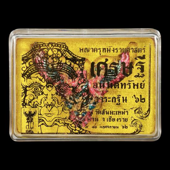 พญาครุฑมังรายศาสตร์ " เศรษฐีอนันตทรัพย์ " ครูบาวิรุต ญาณสํวโร วัดสันมะเหม้า อ.พาน จ.เชียงราย พิมพ์ใหญ่ เนื้อชนวนทองขาว ลงยาองค์ชมพู หมายเลข ๔๙๒ แยกชุดกรรมการ พร้อมกล่องเดิม