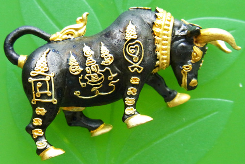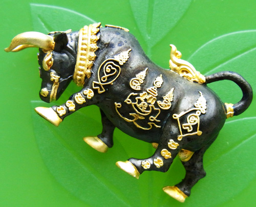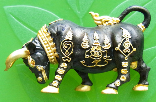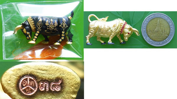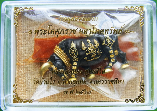 พระโคศุภราช มหาโภคทรัพย์ วัวธนู รุ่นแรก หลวงพ่อทอง วัดบ้านไร่ ปี 2564 เนื้อนวโลหะยันต์ทอง พร้อมจีวรหลวงพ่อ