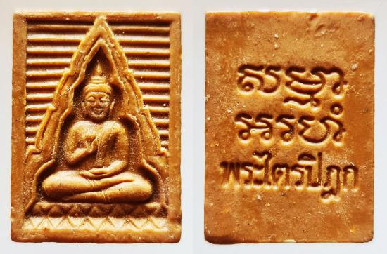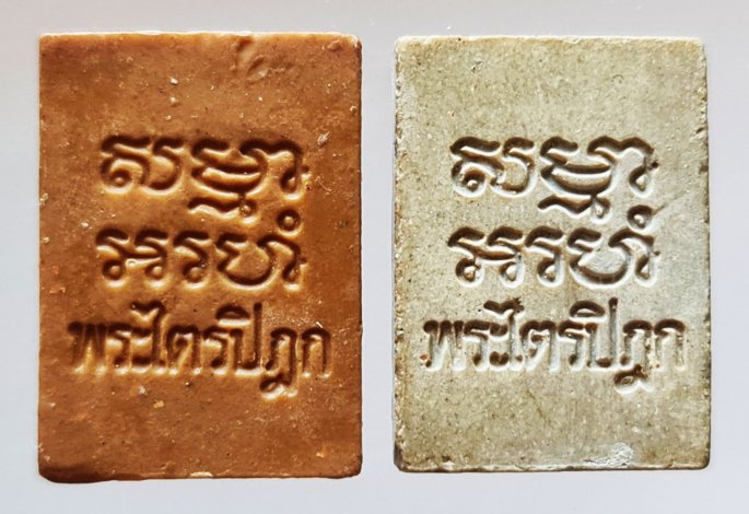 พระผงของขวัญ วัดปากน้ำ รุ่น 6 พระไตรปิฏก พิมพ์แป๊ะยิ้ม(นิยม)เนื้อฟักทอง อันดับหนึ่งของรุ่น มีชิ้นทอง (สภาพด้านหน้าถูกกดทับหย่อนสวยไปหน่อย ตามรูป) อีกองค์เป็นเนื้อธรรมดา (มีกระเทาะขอบซุ้มมุมขวาตรงหัวเข่าองค์พระ ตามรูป)