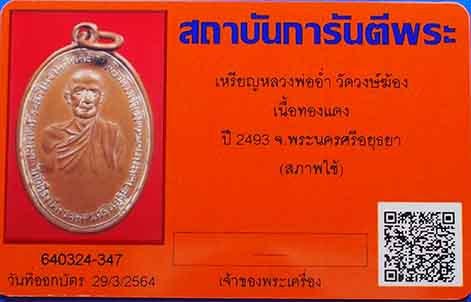 เหรียญหลวงพ่ออ่ำ วัดวงษ์ฆ้อง เนื้อทองแดง ปี 2493 จ.พระนครศรีอยุธยา พร้อมบัตรรับรองสถาบันการันตีพระ |