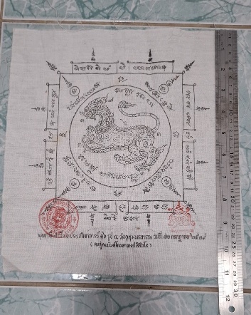 ผ้ายันต์พุทธาภิเษกโดย เกจิอาจารย์ 16 รูปณวัดอุทุมพรทาราม วันที่ 12 กรกฎาคม 2529 ลงสูตรยันโดยอาจารย์ สิริวโร กว้าง 10 นิ้วครึ่ง ยาว 11 นิ้ว |