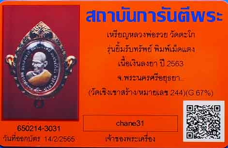 เหรียญหลวงพ่อรวย วัดตะโก รุ่นยิ้มรับทรัพย์ พิมพ์เม็ดแตง เนื้อเงินลงยา ปี 2563 จ.พระนครศรีอยุธยา (วัดเชิงเขาสร้าง) หมายเลข 244 เลี่ยมกรอบทองคำแท้ 67% พร้อมกล่องเดิม และบัตรรับรองสถาบันการันตีพระ |