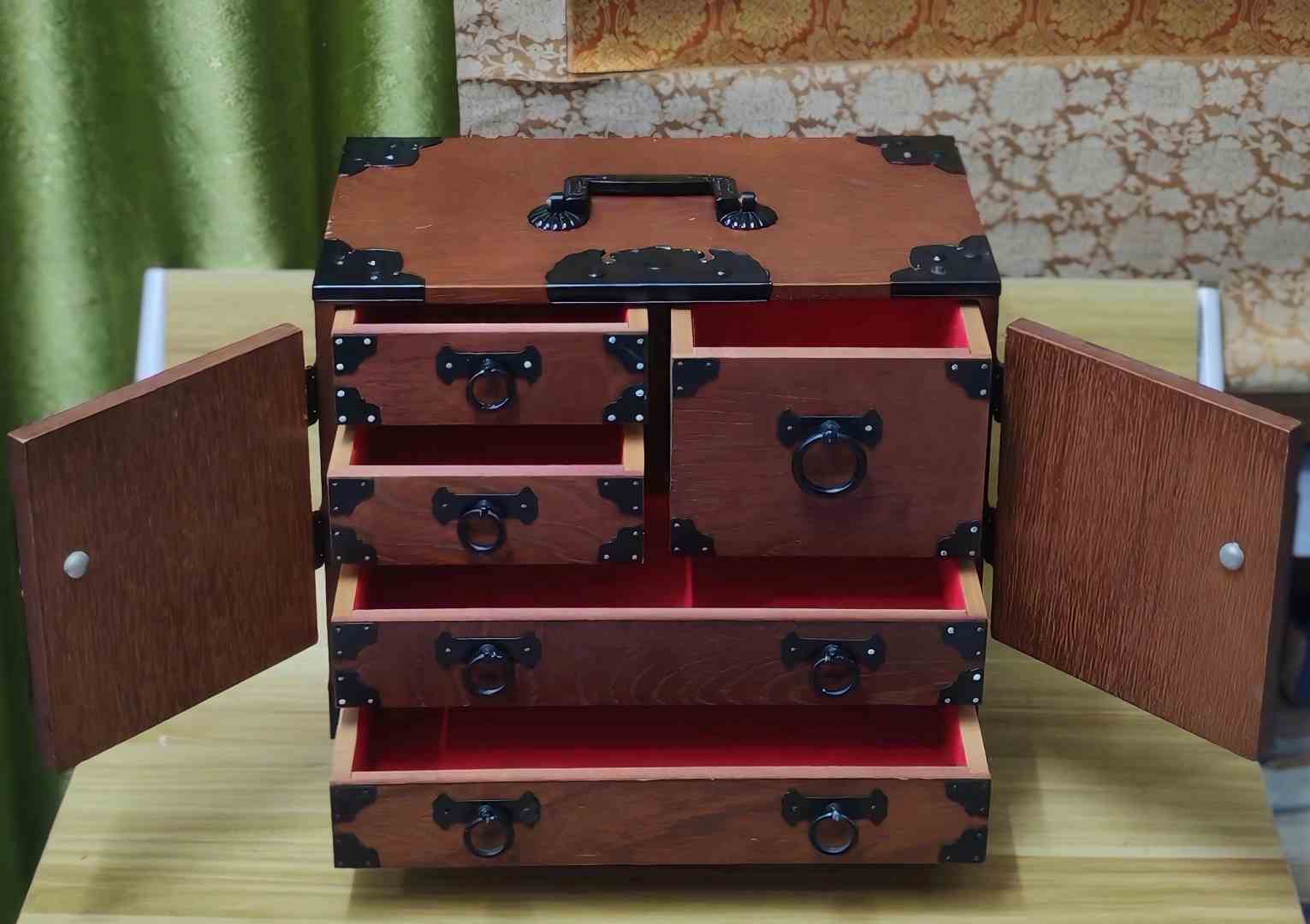 กล่องลิ้นชัก ญี่ปุ่น งานปราณีต ไม้เนื้อแข็งฝังหมุดประดับลวดลายโลหะ ขนาดใหญ่ยาว 32เซนติเมตร