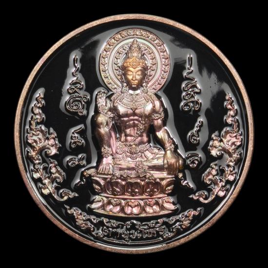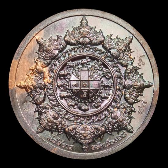 เหรียญบรมครูตาขุนโหร หลักเมือง ๖๘ รุ่น "พ่อให้รวย" นครศรีธรรมราช จัดสร้างโดย หมึก ท่าพระจันทร์ เนื้อทองแดงผิวรุ้งลงยาดำ หมายเลข ๗๔ (เลขสองหลัก) พร้อมกล่องเดิม ปลุกเสก ๔ วาระ พิธีใหญ่แห่งปี เกจิดังทั่วประเทศร่วมปลุกเสก