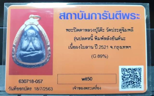 พระปิดตาปลดหนี้หลังยันต์นะ หลวงปู่โต๊ะ วัดประดู่ฉิมพลี เนื้อผงใบลานหลังยันต์นะ พร้อมบัตรรับรองเลี่ยมทองเปอร์สูง(G 89%)สวยๆครับ
