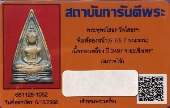 หลวงพ่อโสธร ปี 2497 พิมพ์ 57-57 วงแหวนเต็มวง หลวงพ่อโสธรรุ่นนี้มีหลายพิมพ์ครับ เช่น 57-67,67-67,57-57 ซึ่งพิมพ์ 57-57 วงแหวน จะถือว่าเป็นพิมพ์ที่นิยมที่สุด + บัตร g pra ครับ