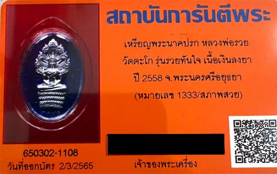 ชื่อพระเครื่อง (((บัตรสภาพสวย))) หลวงพ่อรวย วัดตะโก รุ่น ปรกรวยทันใจ ปี 58 เนื้อเงินลงยาน้ำเงิน No. 1333 พระสวย เลี่ยมทอง3ห่วง