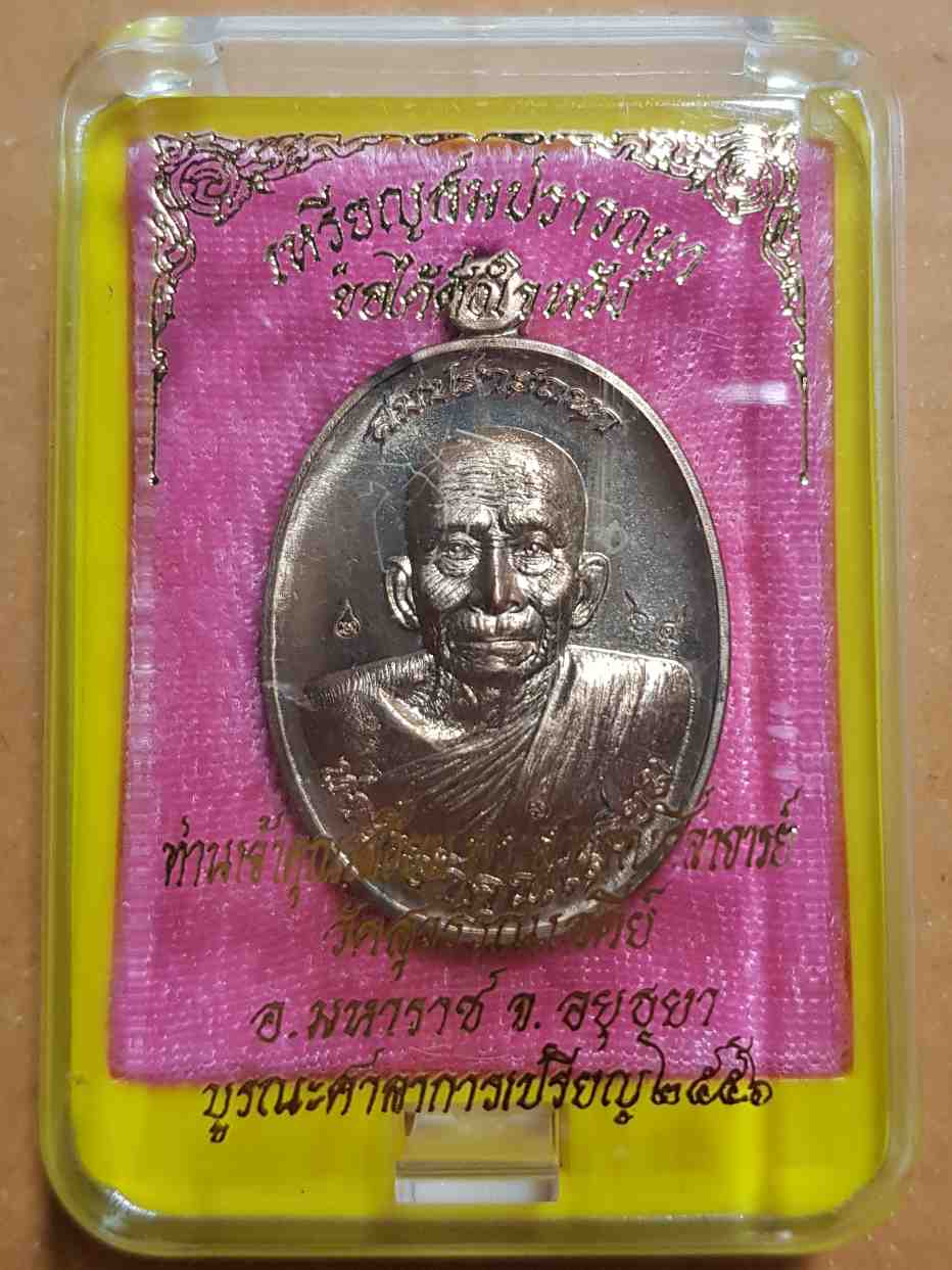 เหรียญสมปรารถนา ท่านเจ้าคุณเสงี่ยม วัดสุวรรณเจดีย์ จ.อยุธยา พ.ศ.2556 เนื้อนวะโลหะ หลังแบบ ตอกโค้ด หมายเลข 64 สภาพสวยพร้อมกล่องเดิม