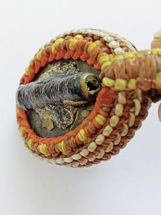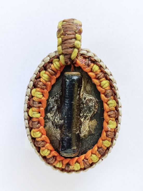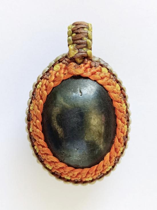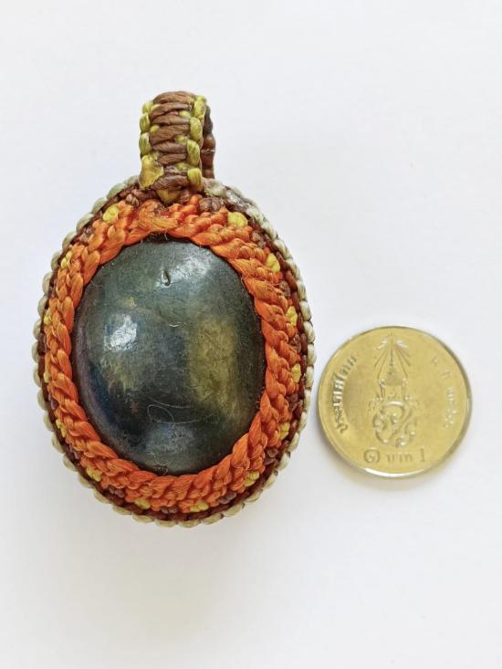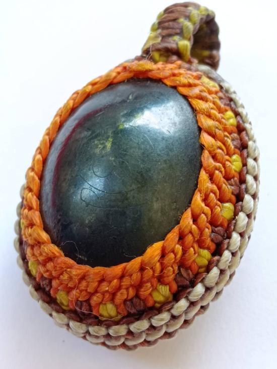 เบี้ยแก้เก่า มีจารมือ มีตะกรุดด้านหลัง ไม่ทราบที่ ไม่รู้วัด ถักเชือกพร้อมบูชา |
