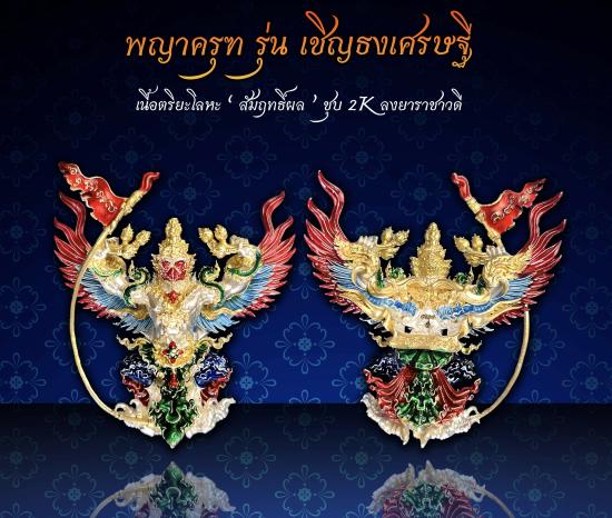 พญาครุฑทรงมหิธานุภาพ เชิญธงเศรษฐี วัดครุฑธาราม จ.พระนครศรีอยุธยา พิมพ์ใหญ่ สูง 4.5 ซ.ม. เนื้อตริยะโลหะ (สัมฤทธิ์ผล) ชุบ 2 K ลงยาราชาวดี ซีลเดิมยังไม่ได้แกะ |