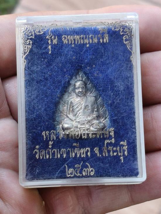 "เคาะเดียว"รูปหล่อใบโพธิ์หลวงพ่อประดิษฐ์ วัดถ้ำเขาเขียว จ.สระบุรี ปี2536 เนื้อเงิน กล่องเดิม |