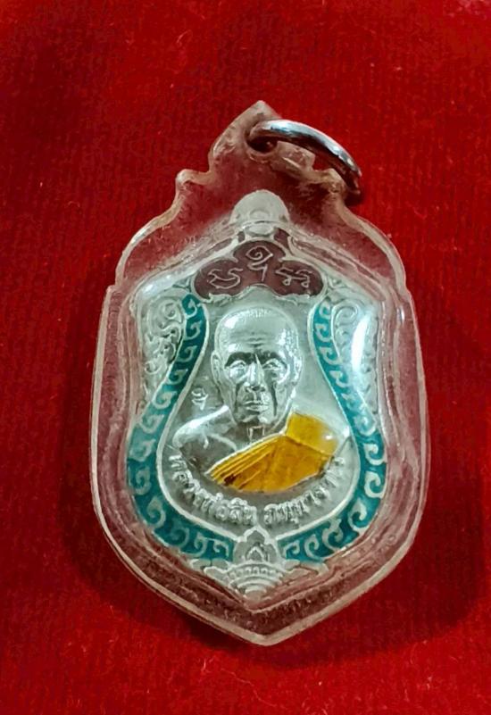 เหรียญเสมาเล็ก หลวงพ่อสิน วัดละหารใหญ่ ระยอง รุ่นเจริญพร ปี 2552 เนื้อเงินลงยา 3 สี ตอกโค๊ต หมายเลข ๓๙๙๙ พร้อมเลี่ยม |