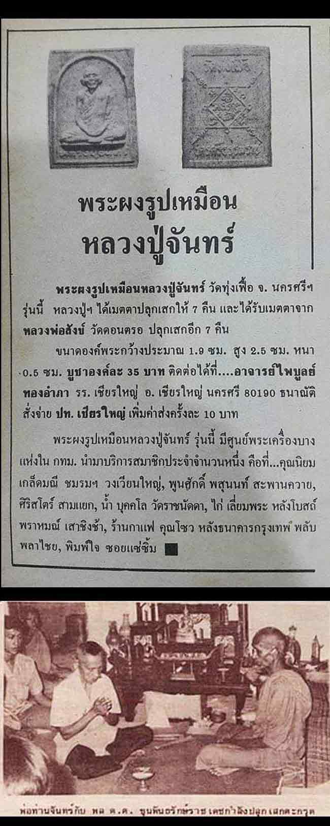 หลวงปู่จันทร์ วัดทุ่งเฟื้อ อ. เชียรใหญ่ จ.นครศรีฯ ว่ากันว่าหลวงหลวงปู่จันทร์ท่านนี้มีวิชาอาคมแก่กล้ามีญาณสมาธิสูงไม่เป็นสองรองใคร ของเมืองนครศรีธรรมราช พระรูปเหมือนหลวงปู่จันทร์ วัดทุ่งเฟื้อ เนื้อผงพุทธคุณผสมเกศา รุ่นแรกของท่านนี้ได้สร้างขึ้นเพื่อเป็นที่ระลึกสำหรับสาธุชนที่มีจิตศรัทธาในการร่วมทำบุญสบทบทุนสร้างกุฏิของหลวงปู่จันทร์ ณ.วัดทุ่งเฟื้อ มีส่วนผสมจากผงพุทธคุณอันศักดิ์สิทธิ์ ที่หลวงปู่รวบรวมไว้โดยเฉพาะ รวมทั้งผงดินจากสถานที่ศักดิ์สิทธิ์ของ 14 จังหวัดภาคใต้ มีลักษณะด้านหน้าเป็นรูปเหมือนหลวงปู่จันทร์ ด่านล่างเขียน "หลวงปู่จันทร์" ด้านหลังส่วนบนเขียนว่า "วัดทุ่งเฟื้อ" ถัดลงมาเป็นยันต์ ส่วนล่างมีหนึ่งแถวเขียนว่า " นครศรีธรรมราช" มีขนาดกว้าง 2 ซม. สูง 3 ซม. หนา 0.5 ซม. จำนวนสร้างประมาณ 5,000 องค์ นับได้ว่าเป็นพระรูปเหมือนขนาดกระทัดรัดมาก เนื้อมวลสารมีทั้งสีขาวเหลืองนวล องค์พระส่วนใหญ่เป็นสีขาว อมเหลือง และได้ผ่านการบรรจุพุทธานุภาพโดยการปลุกเสกเดี่ยวของ หลวงปู่จันทร์ เมื่อปลายเดือน พ.ย. 2527 ตลอด 1 สัปดาห์เต็มๆ สร้างโดยลูกหลานชาวใต้ผู้ที่มีความเคารพศรัทธาเลี่อมใส่ในหลวงปู่จันทร์เป็นสรณะ ด้วยความขลังที่แฝงด้วยมนต์เสน่ห์ของพิมพ์รูปเหมือนนั่งเต็มองค์อ่อนช้อยสวยงาม บวกกับมวลสารที่ผสมไปด้วยเกศาไปทั่วองค์พระ ว่าไปแล้วเหมือนได้อยู่ใกล้ๆท่านในยามพกมาทั่วทุกสารทิศ จึงทำให้พุทธคุณเปี่ยมล้นไปด้วยเมตตามหานิยมและแคล้วคลาดปลอดภัยเป็นเอก