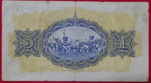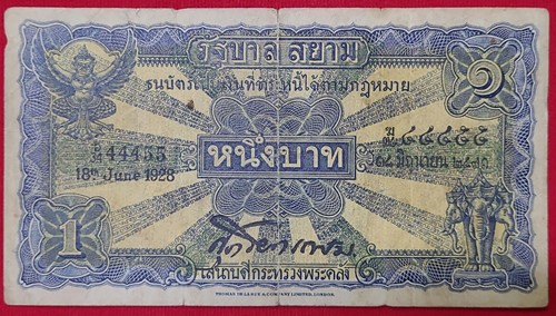 ธนบัตรหนึ่งบาท ไถนา แบบ2 รัชกาลที่ 7 หมายเลขสวย 34D 44455 - ๓๔ฆ ๔๔๔๕๕ ลายเซ็น ศุภโยคเกษม ประกาศใช้ เมื่อ วันที่ 19 กุมภาพันธ์ พ.ศ. 2471 สภาพเก่า มีรอยพับกลางขาดเล็กน้อย