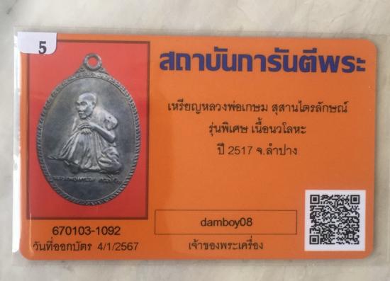 เหรียญหลวงพ่อเกษม รุ่นพิเศษหรือรุ่นนั่งหนาว ปี 2517 เนื้อนวโลหะ สภาพสวยเก็บเก่า เนื้อนี้หายาก จำนวนการจัดสร้างน้อย มาพร้อมบัตรรับรองจากสถาบันการันตีพระ