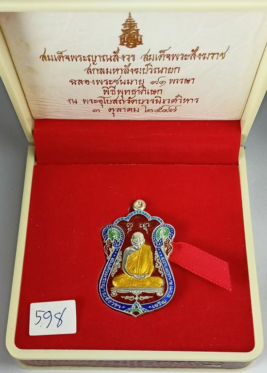 เหรียญสมเด็จญาณสังวร "ฉลองพระชนมายุ 91 พรรษา" วัดบวร ปี47 เนื้อเงินลงยาขุ้ยพื้นสีแดง เบอร์ 598 พร้อมกล่องเดิมครับ (S)