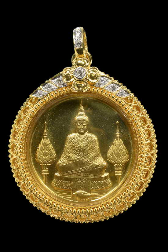 เหรียญพระแก้วมรกต เนื้อทองคำ "ภปร" วัดพระศรีรัตนศาสดาราม (วัดพระแก้ว)ปี2525 รุ่นแรก(ด้านหลัง ใม่มี ราชศรัทธา นิยมสุด)เลี่ยมทองฝังเพชรแท้ พร้อมขึ้นคอ สวยมากๆ เพชรน้ำงามๆ
