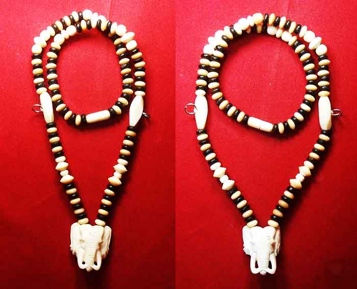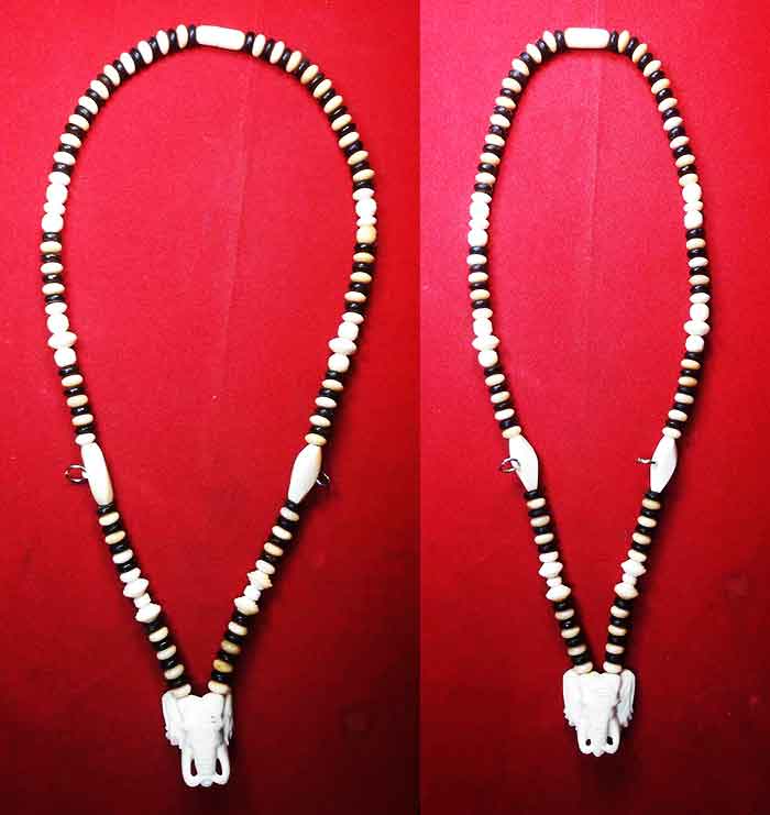 สร้อยหัวช้าง เม็ดกระดูกช้างผสมกะลาเม็ดกะลาตาเดียว ขนาดเส้นผ่าศูนย์กลาง 8.5 ม.ม.หนา 3 ม.ม.ห้อยพระจำนวน 3 องค์ ความยาว 26 นิ้ว