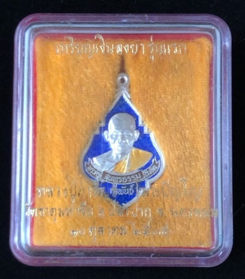 เหรียญรุ่นแรก หลวงปู่คำพันธ์ วัดธาตุมหาชัย เนื้อเงินลงยา ปี 2535 สภาพสวย มาพร้อมกล่องเดิมครับ