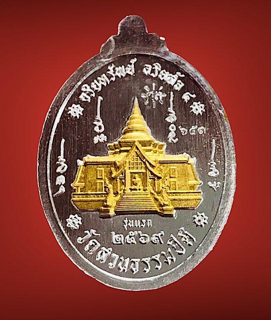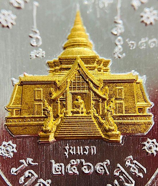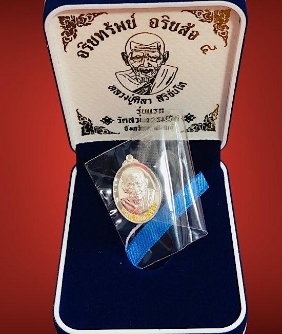 หลวงปู่มหาศิลาเม็ดแตง อริยทรัพย์ อริยสัจ 4เนื้อเงินผิวสวยกระจกหลังเจดีย์ทอง จมูก100 เลข 653 กล่องเดิม สภาพสวยๆ