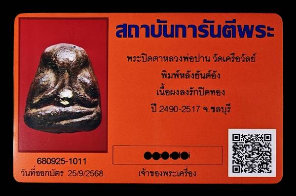 ปิดตาหลวงพ่อปาน วัดเครือวัลย์ ชลบุรี พิมพ์หลังยันต์อัง หายาก เนื้อผงลงรัก ปี 2490-2517 จ.ชลบุรี พระสวยรักแดงๆครับ พร้อมบัตรรับรอง.....