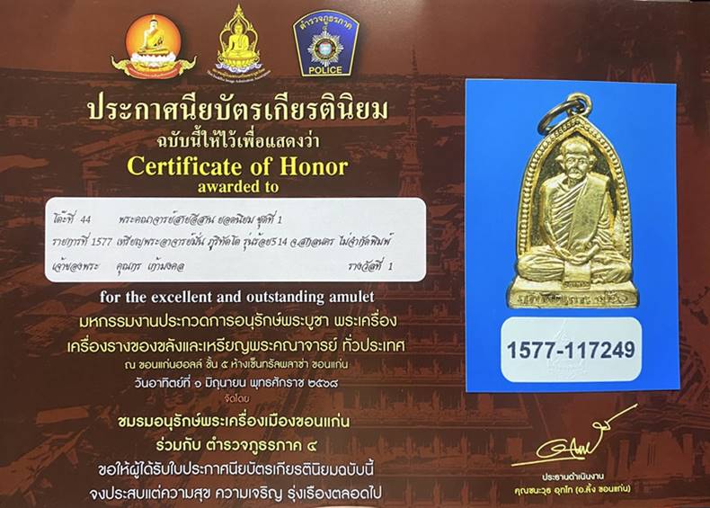 มีดีกรีแชมป์ รางวัลที่ 1 งานใหญ่ของสมาคมผู้นิยมพระเครื่องพระบูชาไทย จัดโดยชมรมอนุรักษ์พระเครื่องเมืองขอนแก่น วันที่ 01 มิ.ย. 68 จัดที่ ขอนแก่น ฮอลล์ เซ็นทรัลขอนแก่น