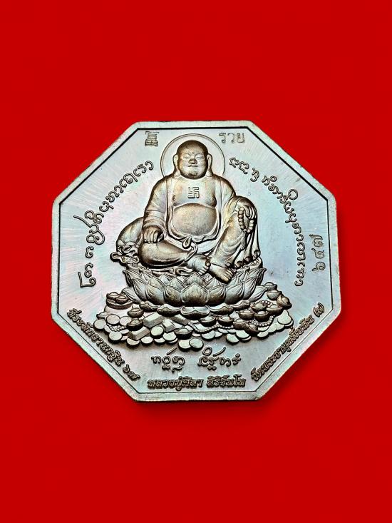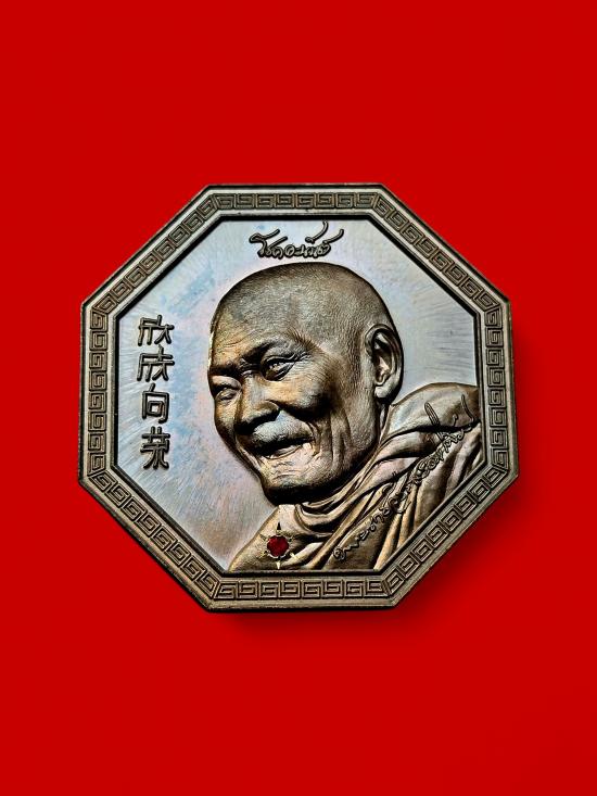 เหรียญแปดเหลี่ยม รวยแปดทิศ โชคอะนันต์ หลวงปู่มหาศิลา หลวงปู่ศิลา สิริจันโท ธรรมอุทยาน วัดพระธาตุหมื่นหิน จ.กาฬสินธุ์ เนื้อมหาชนวนมวลสาร เลข ๖๔๗ มีกล่องเดิม พิเศษฝังพลอยแดง