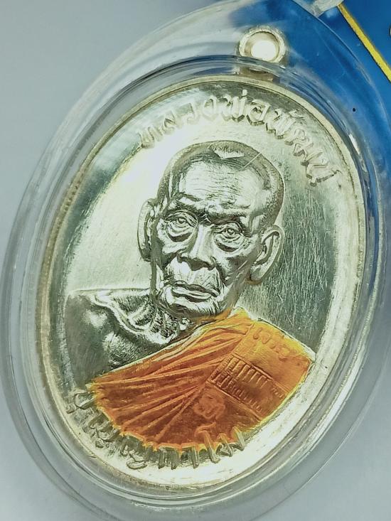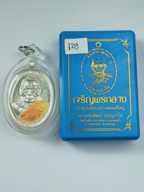 ("บล็อกทองคำ โม โ-โค้ง") เหรียญรุ่นเจริญพรกลาง (พิมพ์ครึ่งองค์) หลวงพ่อพัฒน์ วัดห้วยด้วน เนื้อเงินลงยาจีวร "บล็อกทองคำ" เบอร์ 129 พร้อมเลี่ยม และกล่องเดิมครับ (น้ำหนักรวม 20.94 กรัม)