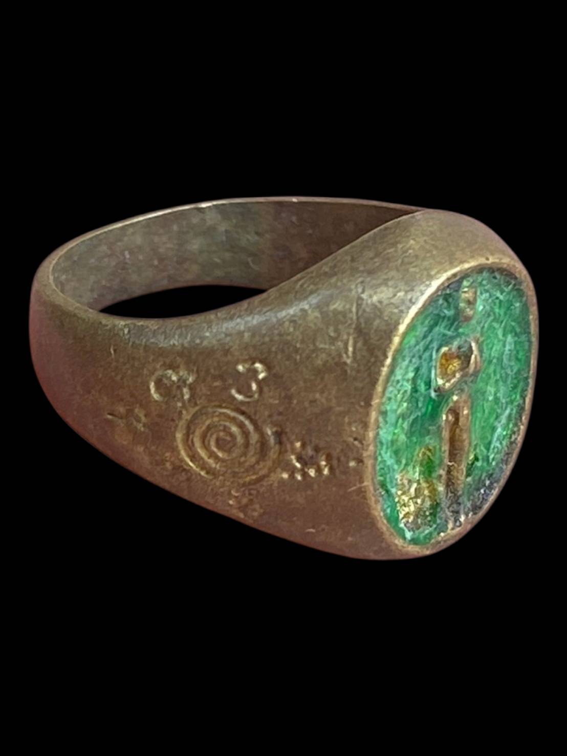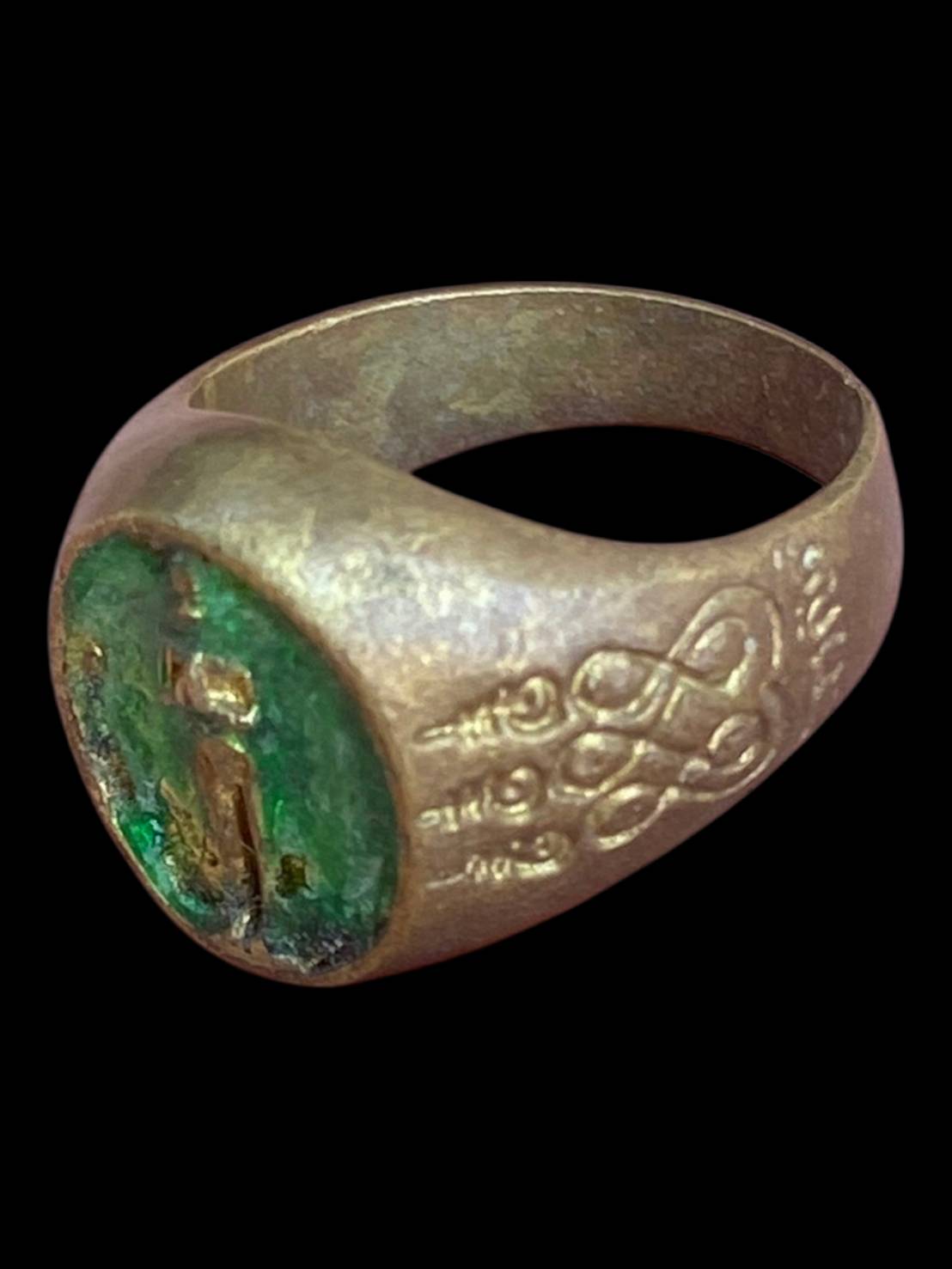 รายละเอียด แหวนเก่าไม่ทราบที่ ลักษณะเป็นแหวนงานเก่าทรงหนา ตัวเรือนโลหะเก่ามีคราบอายุและร่องรอยการใช้งาน ผิวเดิมไม่ผ่านการขัดแต่ง หน้าแหวนฝังวัสดุสีเขียว ลวดลายภายในสึกตามกาลเวลา ด้านข้างตัวเรือนมีลายจารหรืออักขระเก่า พิจารณาตามภาพและความพอใจเป็นหลัก เหมาะสำหรับสายเครื่องรางหรือผู้ที่มองหาแหวนเก่าไว้สะสม