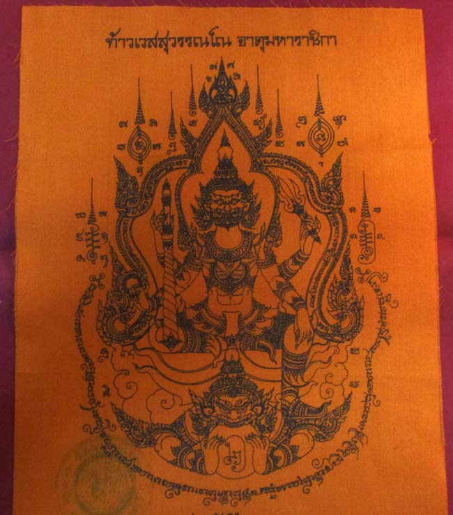 ผ้ายันต์ ท้าวเวสสุวรรณ จาตุมหาราชิกา วัดจุกกะเฉอ ต.บึง อ.ศรีราชา จ.ชลบุรี ครับ (พระบ้าน ครับ) |