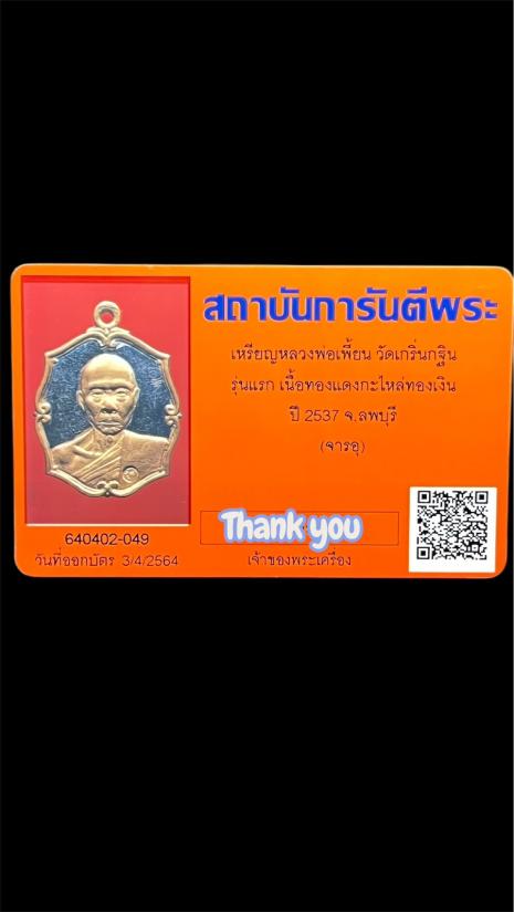 เหรียญหลวงพ่อเพี้ยน วัดเกริ่นกฐิน รุ่นแรก เนื้อทองแดงกะไหล่ทองเงิน ปี 2537 จ.ลพบุรี (จารอ)