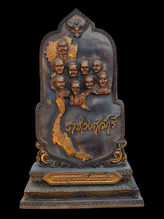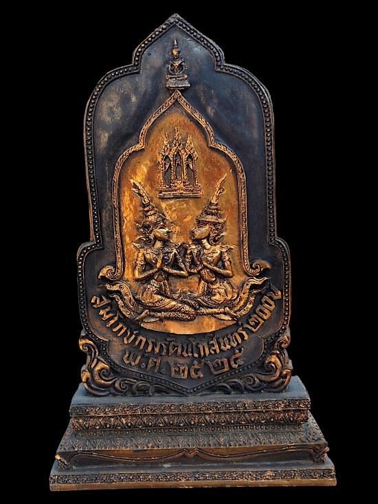 แผ่นบูชาราชวงศ์จักรี พิธีสมโภชกรุงรัตนโกสินทร์ 200 ปี พ.ศ.2525 กว้าง5.5 นิ้ว สูง12 นิ้ว ฐานกว้าง 7 นิ้ว