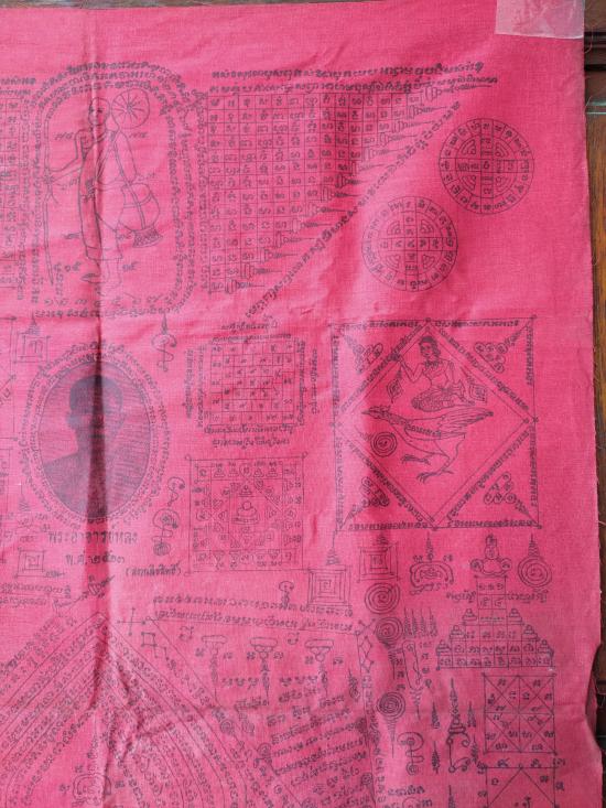 แต่ผืนจริงไม่ซีดครับ (สีแดงสดแบบรูปเต็มรูปแรกเลย) หมึกพิมพ์ยันต์อักขระติดชัดทั้งหมด ไม่จาง เจ้าของเก็บพับเดิม ๆ ไม่เคยใช้ครับ